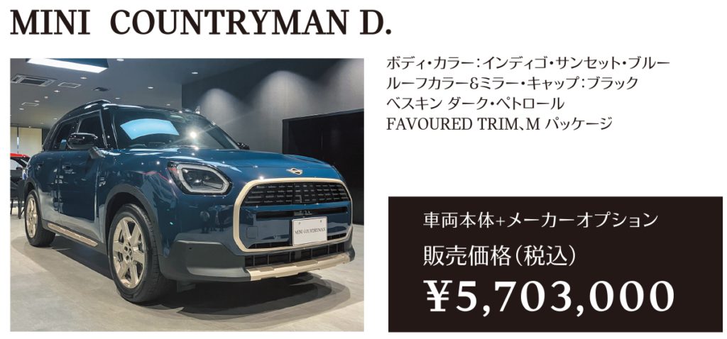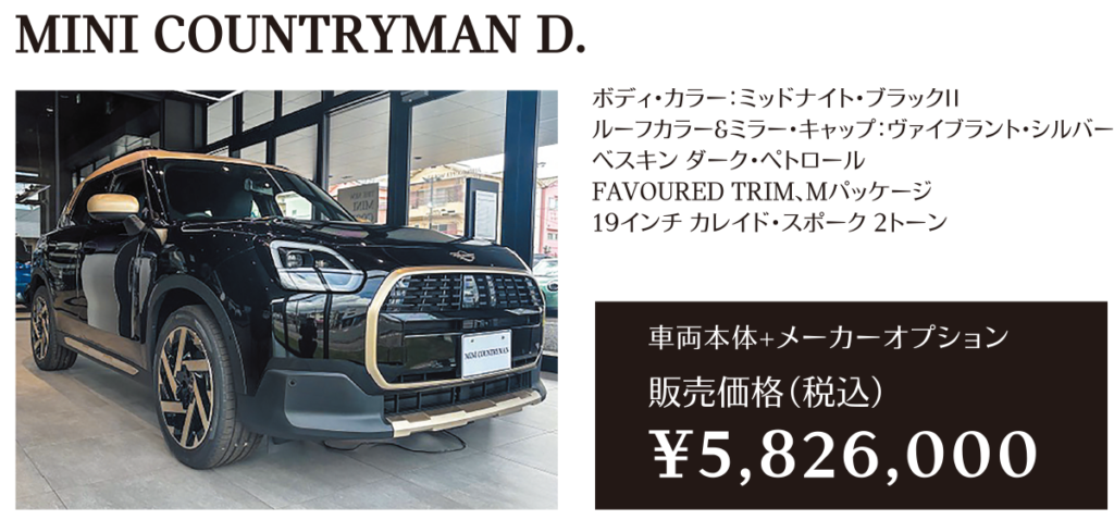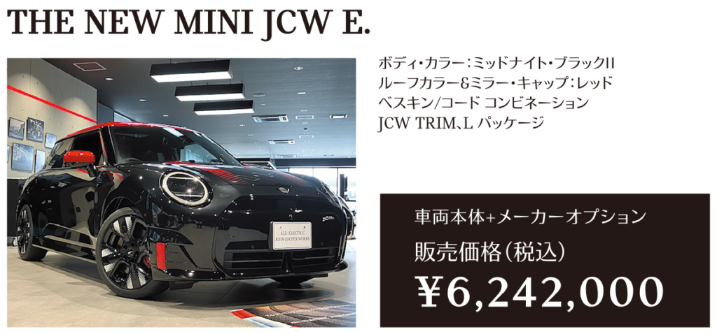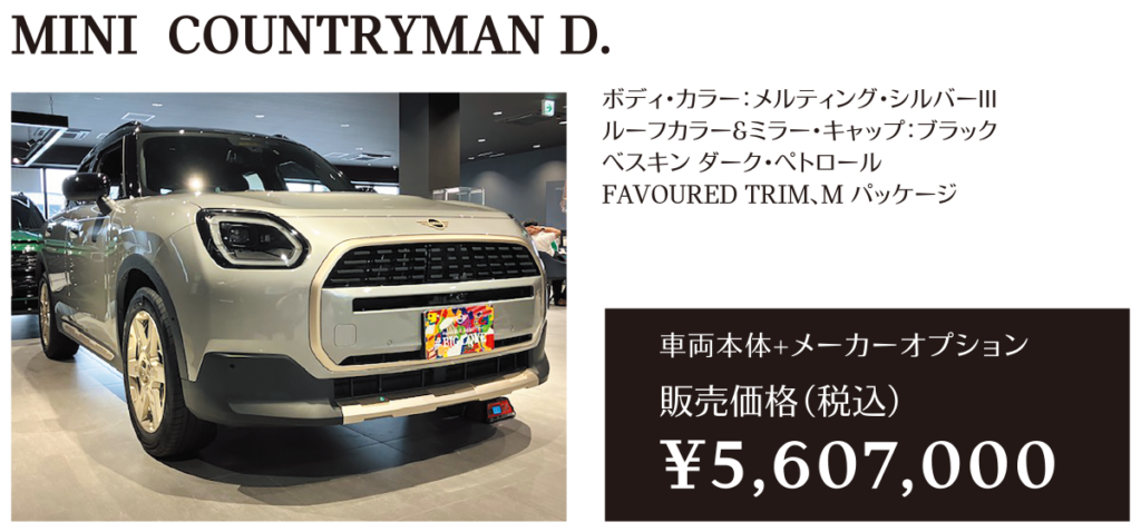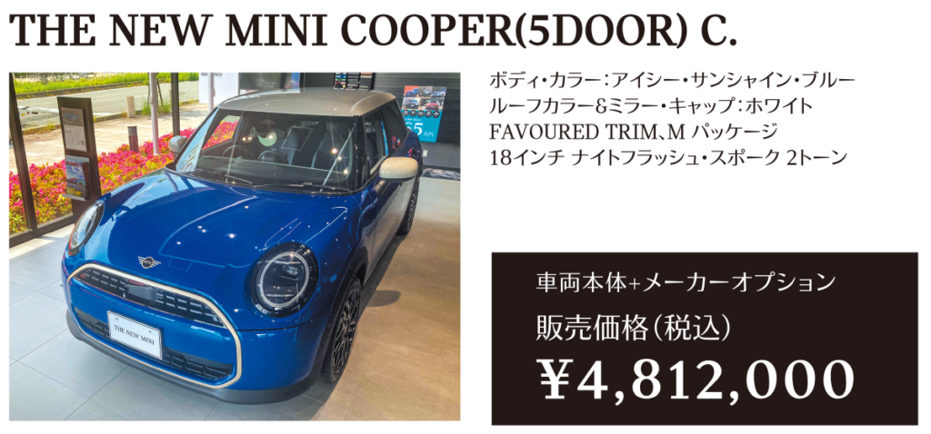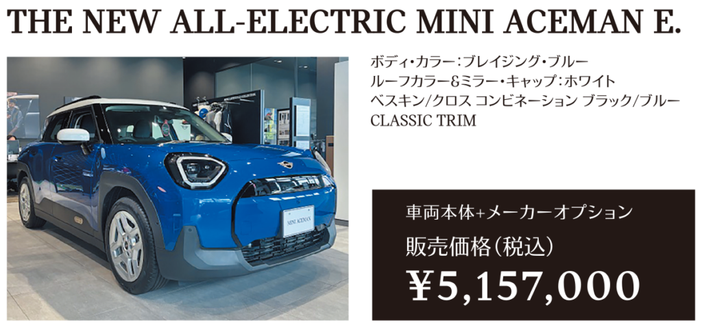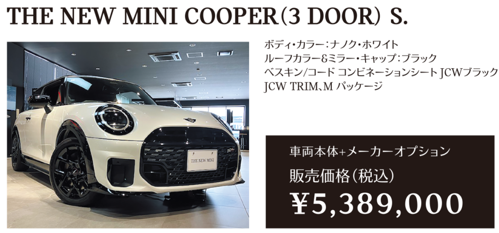 ※メーカー希望小売価格は車両本体価格(消費税込)価格を表示しています。保険料、税金(消費税を除く)、登録に伴う諸費用、リサイクル料金は含まれておりません。別途必要となります。詳細につきましてはお近くのMINI正規ディーラーまでお問い合わせください。※掲載の写真は、日本仕様のモデルと細部で異なる場合があり、一部イメージ画像も含まれます。本仕様、諸元、価格等、記載の内容は2025年6月現在のものであり、予告なく変更される場合があります。写真は実際の色と異なる場合があります。記載事項および写真の版権は、BMWAG(ドイツ)およびビー・エム・ダブリュー株式会社に帰属します。無断転載を禁じます。詳細につきましてはお近くのMINI正規ディーラーにお問い合わせください。